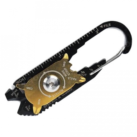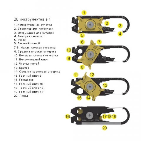 Функции: гаечный ключ - 5 размеров; отвертка с 3мя размерами; крестовая отвертка с 2 мя размерами; гвоздодер; стриппер для проволоки; маникюр; пилка для ногтей; резак; измерительный инструмент; ключ для велосипеда, открывашка для бутылок, серп; кольцо для ключей.