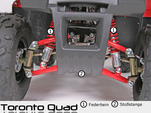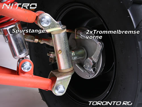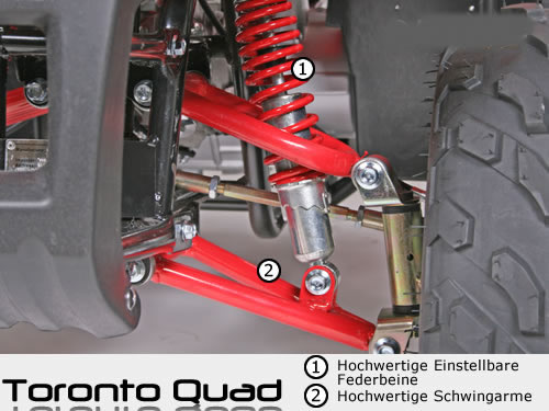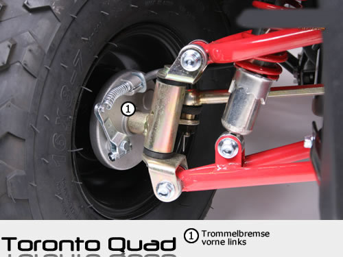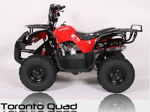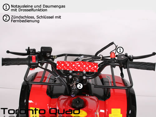 С 65 км / ч максимальная скорость, Торонто предлагает Вам большое удовольствие от вождения. Как и во всех наших квадроциклах скорость может регулировать с помощью регулировочного винта ручке-газа, может регулироваться 10км / ч максимум на этой модели. D его безопасности нет сомнения 2 барабанных тормоза передние и 1 задний гидравлический дисковый тормоз обеспечивают надежное торможение. С помощью пульта ДУ можно заводить Торонто, также концевик глушит квадроцикл, если водитель не удержался в седле.