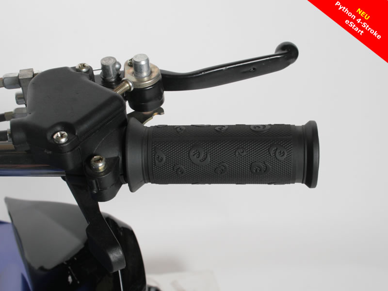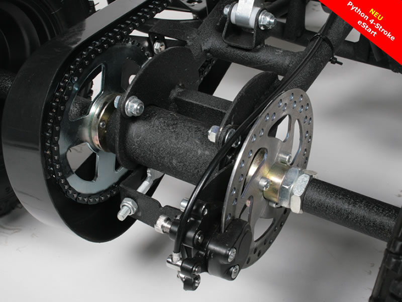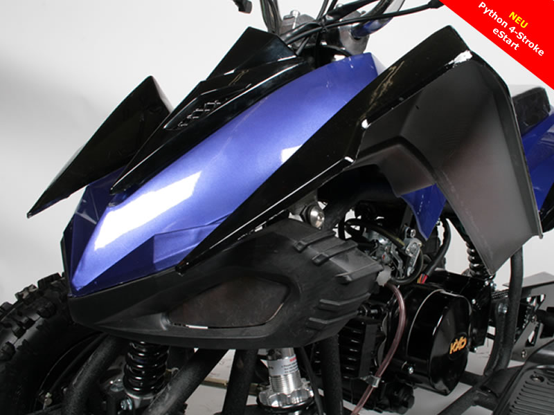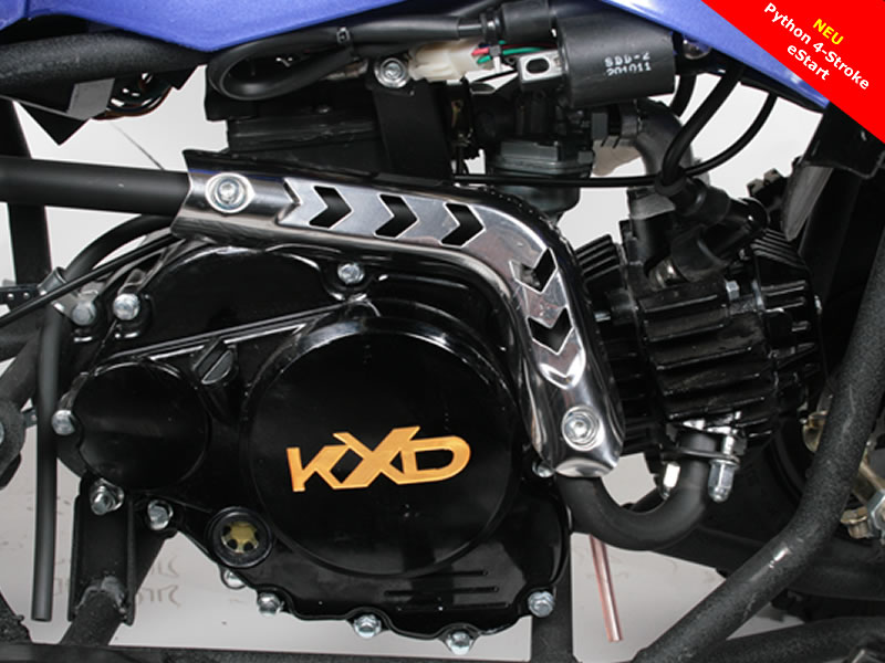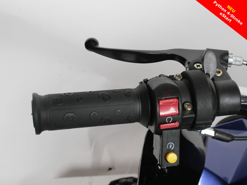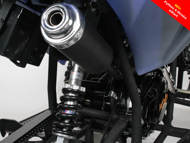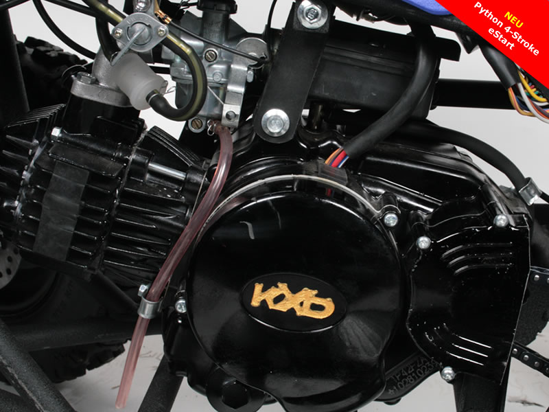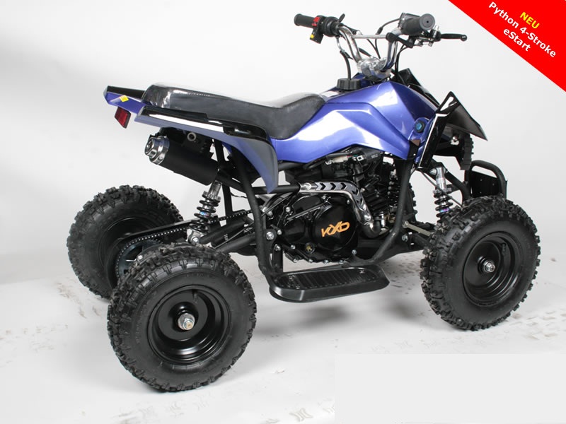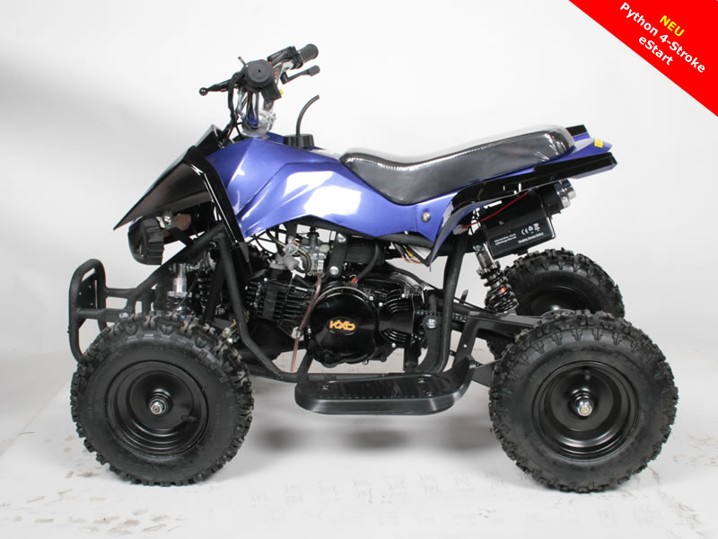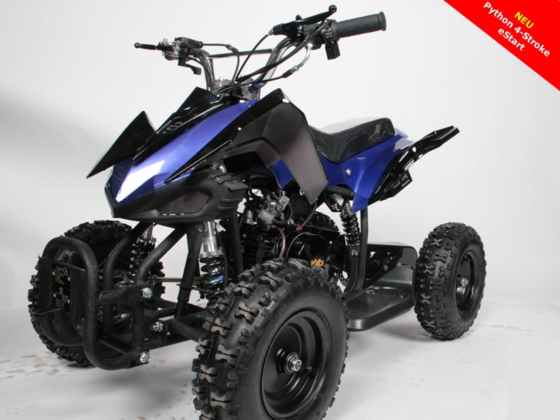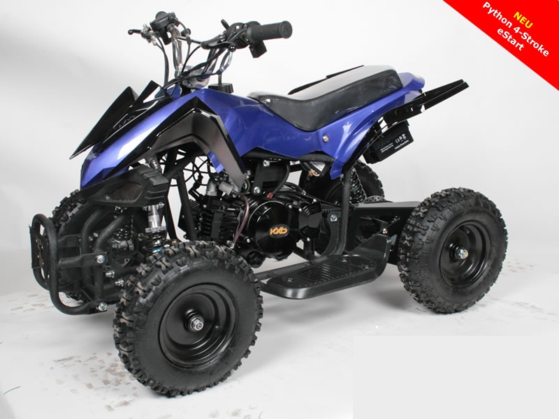 Квадроцикл 49см Python Deluxe Miniquad 4х тактный двигатель 3,5 л.с. с электрическим стартером. Новый, яркий, запоминающийся дизайн, большие 6" шины. Пульт дистанционно управления (с функцией включения и выключения), большие удобные подножки, полная защита цепи, защита выхлопной системы, улучшенный ручной запуск двигателя, спортивный глушитель, дисковые тормоза на все колеса, двигатель работает тихо.